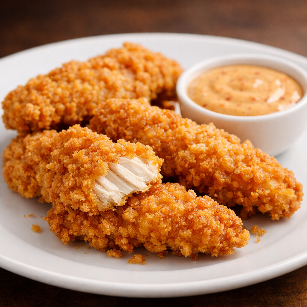 Tender chicken strips coated in seasoned breadcrumbs and fried until golden, offering a crunchy outside and juicy inside, paired with our signature dipping sauce.