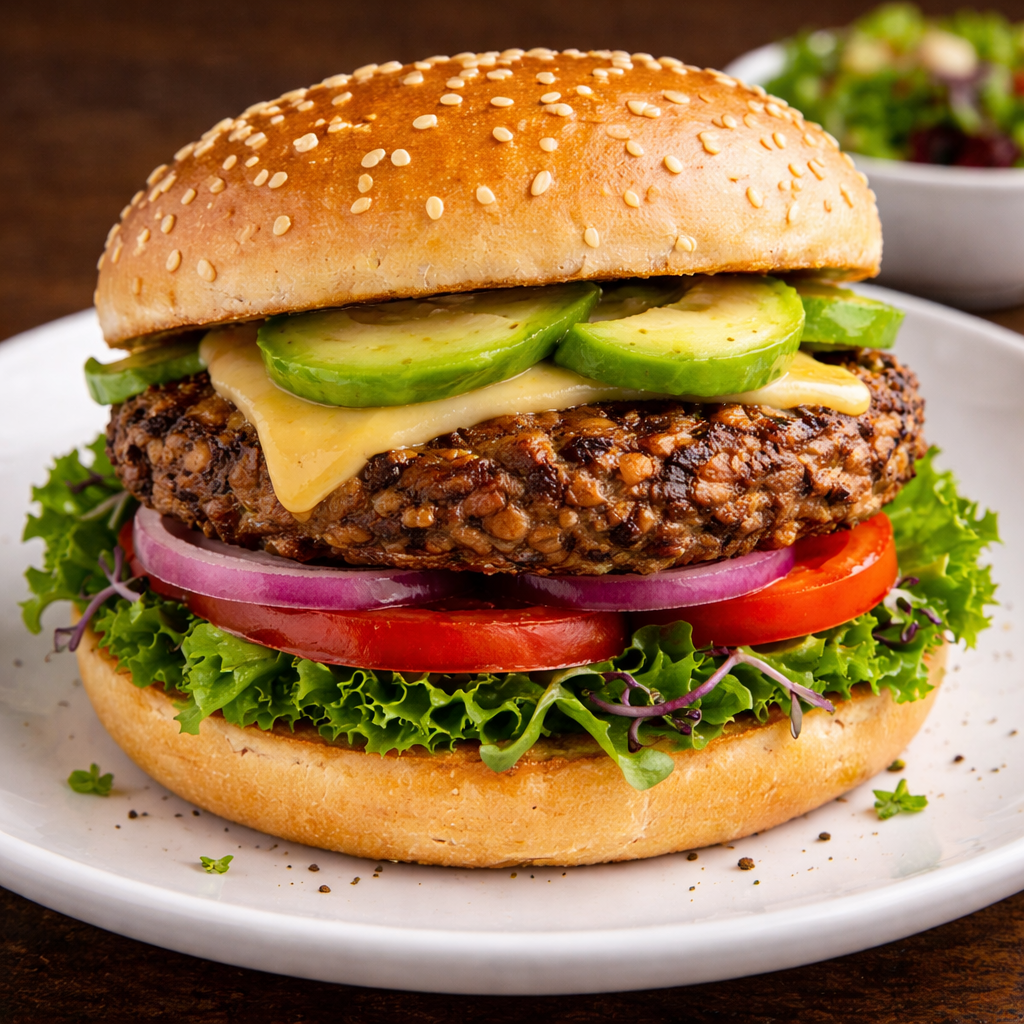 Flavorful plant-based patty served with fresh vegetables, offering a delicious meat-free option.